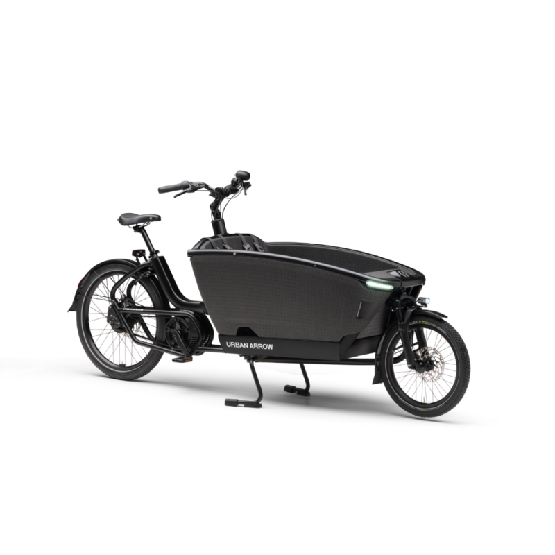 De fiets is verkrijgbaar in groen of zwart en compatibel met diverse originele Urban Arrow-accessoires. De verende voorvork zorgt voor extra comfort en stabiliteit, ook bij oneffenheden of een beladen bak.