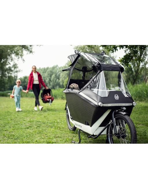 Een toenemend aantal mensen kiest echter voor de Urban Arrow bakfiets als hun belangrijkste duurzame transportmiddel. Met die mensen die het hele jaar door op hun bakfiets in hun omgeving fietsen, wordt de noodzaak van een regenhoes om hun kostbare lading te beschermen bijna vanzelfsprekend. Rekening houdend met de marktvraag heeft Urban Arrow haar reeds succesvolle accessoire als volgt ontwikkeld:
